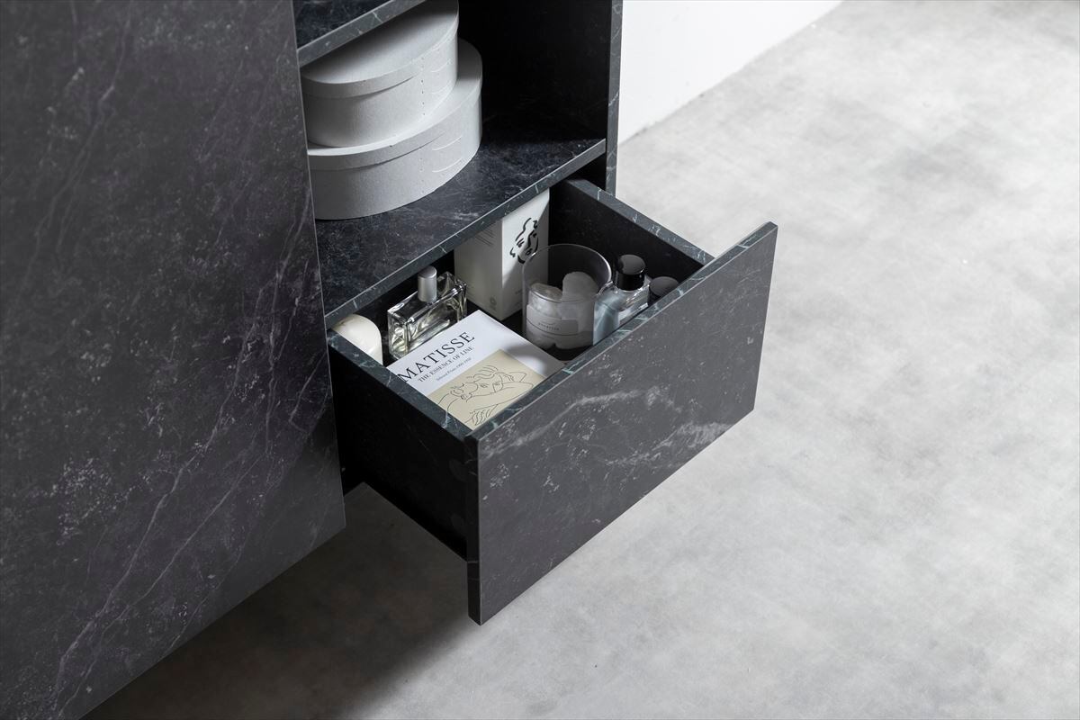 ・おしゃれな大理石柄が特徴で、リビングやダイニングに高級感とスタイリッシュな雰囲気を与えます。優れた収納力を備えており、書籍や小物をスマートに整理できるため、どのインテリアスタイルにも華やかに調和します。